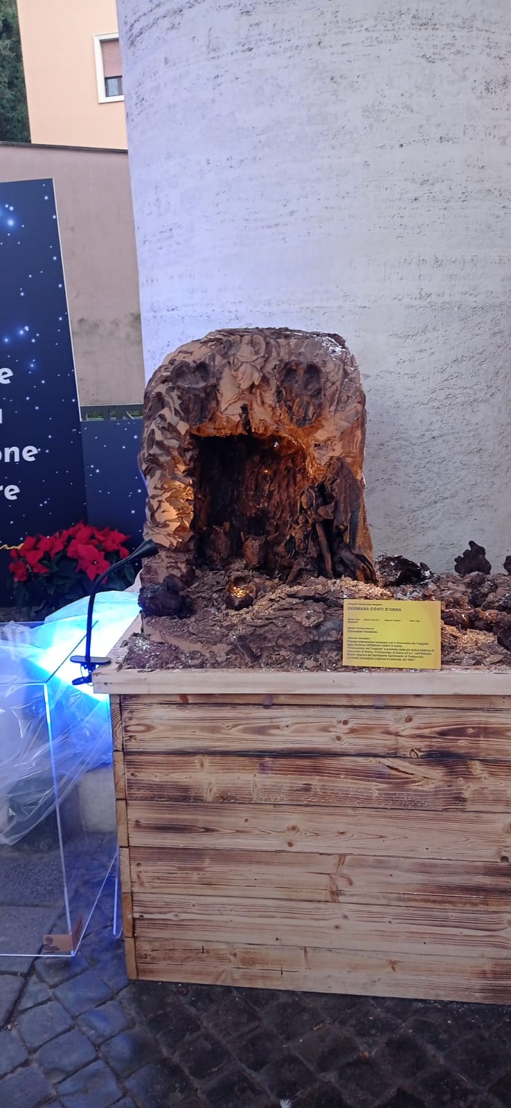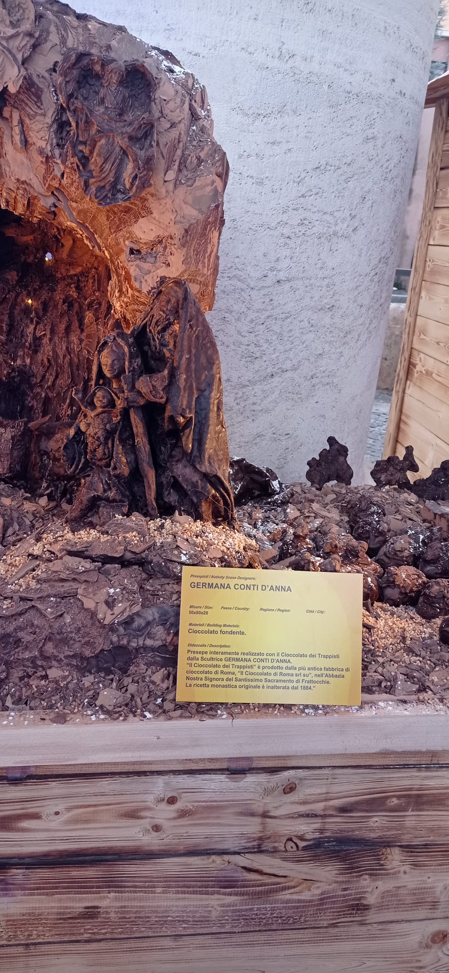 Il Presepe interamente realizzato con il cioccolato, fondente, dei trappisti, realizzato dalla scultrice Germana Conti D’Anna, è prodotto dalla più antica fabbrica di cioccolato di Roma nella Abbazia Nostra Signora del Santissimo Sacramento di Frattocchie la cui ricetta monastica originale è inalterata dal 1884.