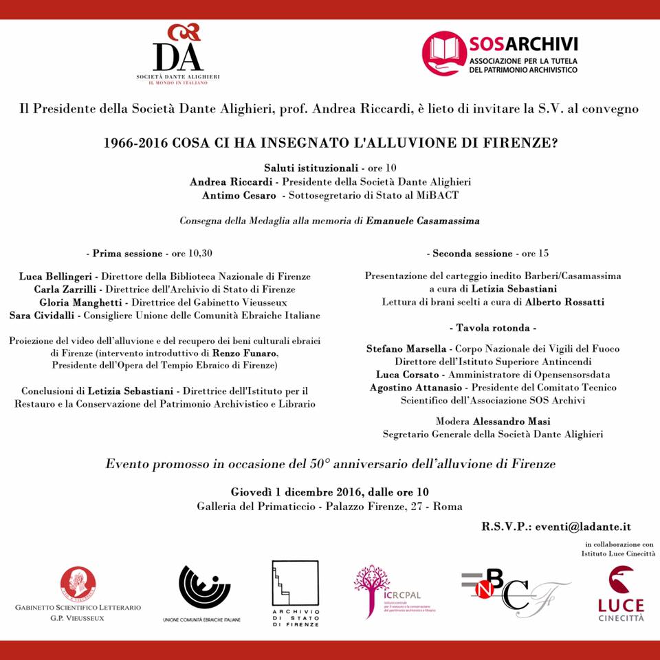 La giornata di studi 1966- 2016: Cosa ci ha insegnato l’alluvione di Firenze? promossa dalla Dante e dell’Associazione SOS Archivi, in collaborazione con Biblioteca Nazionale di Firenze, l’Archivio di Stato di Firenze, il Gabinetto Vieusseux, l’Unione delle Comunità Ebraiche Italiane e Istituto Luce Cinecittà, in programma a Palazzo Firenze il prossimo 1 dicembre dalle ore 10, si concentrerà sugli effetti trasformativi di queste catastrofi nel campo della conservazione, esaminando i traguardi raggiunti nella ricerca di materiali e tecnologie innovativi, nella pratica professionale, nella istruzione e formazione.