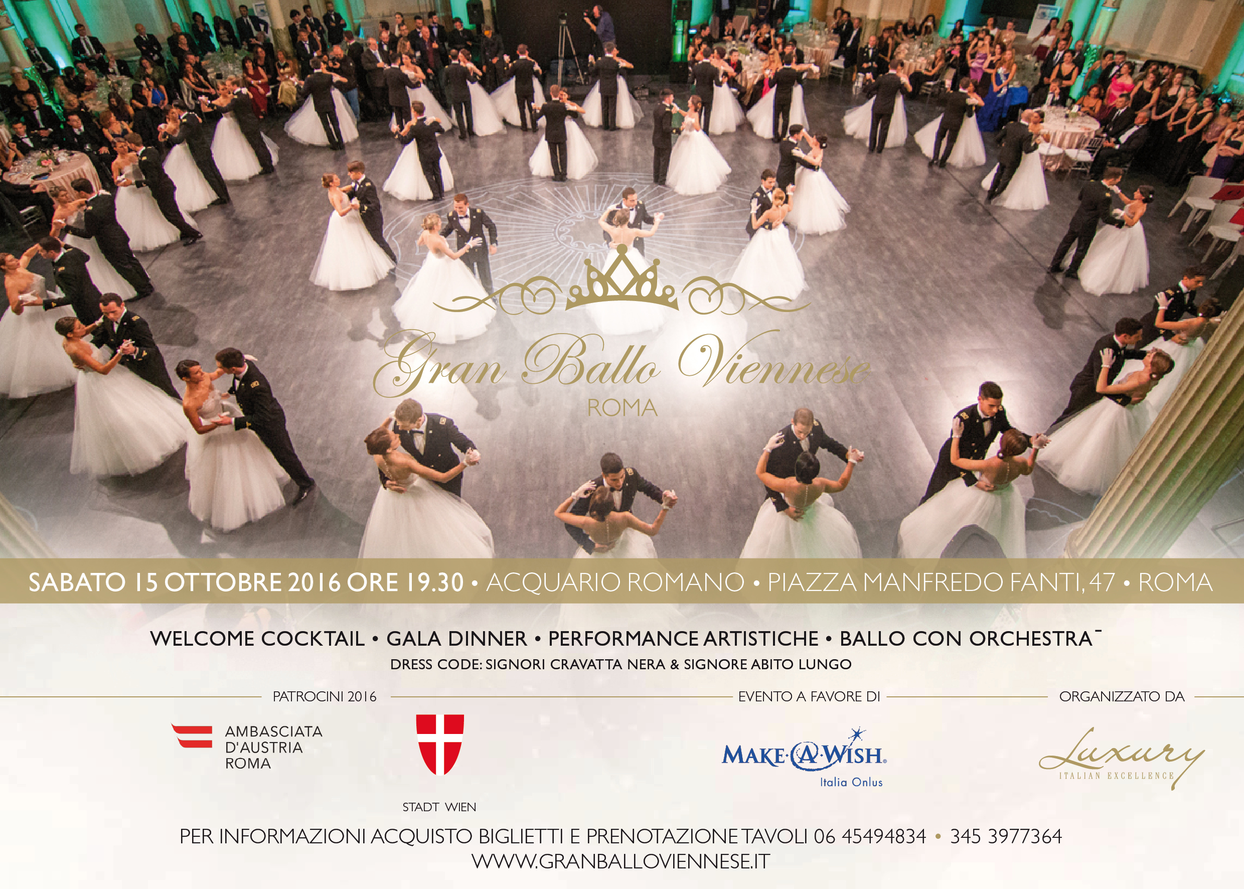 Il Gran Ballo Viennese di Roma si svolge con il Patrocinio della Città di Vienna, l’Ambasciata D’Austria e in collaborazione con: Make-A-Wish Italia Onlus (www.makeawish.it). Un parterre d’eccezione farà da cornice ad una serata indimenticabile alla quale si potrà prendere parte contattando direttamente la Società organizzatrice, ai numeri 06 45494834 – 3453977364 o tramite l’acquisto online su www.granballoviennese.it