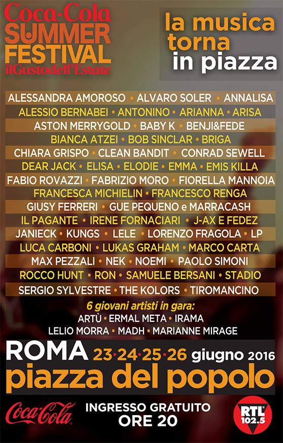 Per quattro sere consecutive, da questa sera fino a Domenica 26 Giugno, Piazza del Popolo a Roma ritorna ad accendersi al suono delle grandi hit dell’estate 2016. Torna infatti il Coca Cola Summer Festival, l’evento musicale condotto da Alessia Marcuzzi, Rudy Zerbi e Angelo Baiguini, che andrà in onda nel mese di Luglio su Canale 5. Ogni sera verrà decretato un vincitore di puntata, mentre nell’ultima scopriremo chi si porterà a casa l’ambito premio di canzone regina dell’estate! Tanti sono gli ospiti attesi in queste quattro serate: