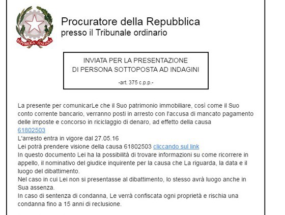 Si legge nella falsa mail: “La presente per comunicarLe che il Suo patrimonio immobiliare, così come il Suo conto corrente bancario, verranno posti in arresto con l’accusa di mancato pagamento delle imposte e concorso in riciclaggio di denaro, ad effetto della causa numero (…) di cui potrà prendere visione cliccando sul link. In questo documento Lei ha la possibilità di trovare informazioni su come ricorrere in appello, il nominativo del giudice inquirente per la causa che La riguarda, la data e il luogo del dibattimento. Nel caso in cui Lei non si presentasse al dibattimento, lo stesso avrà luogo anche in Sua assenza. In caso di sentenza di condanna, Le verrà confiscata ogni proprietà e rischia una condanna fino a 15 anni di reclusione”.