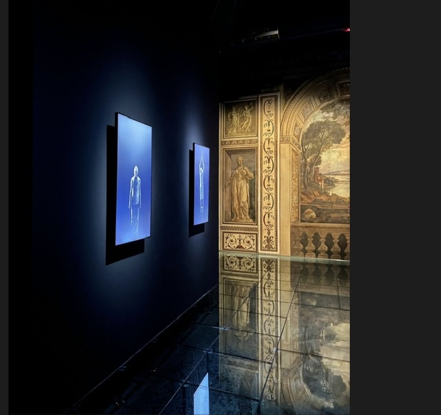 Nei raffinati saloni di Palazzo Bonaparte a Roma che furono dimora di Madama Letizia Ramolino Bonaparte, madre di Napoleone Bonaparte, i visitatori della mostra sono immersi nel buio. L’oscurità lascia percepire solo schegge delle meravigliose decorazioni del palazzo. Si entra in uno spazio visionario all’interno del quale ci troviamo a stabilire una profonda connessione visiva e spirituale con le opere esposte.