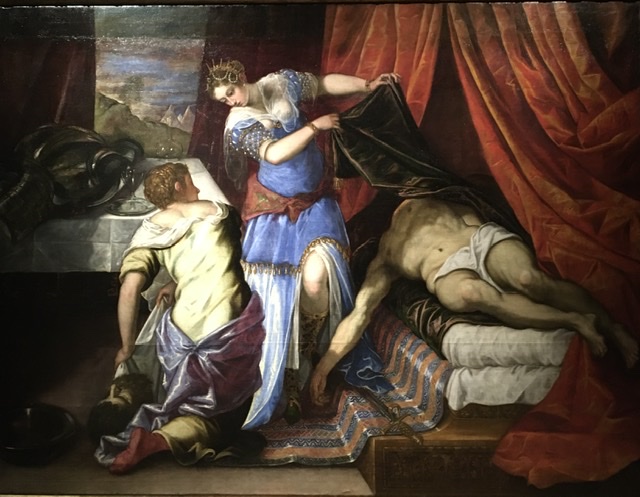 Tintoretto mette in scena un dramma appena concluso con grande dovizia di particolari. Prevale l’atteggiamento riguardoso dell’eroina nei confronti di Oloferne la cui decapitazione viene celata al pubblico.