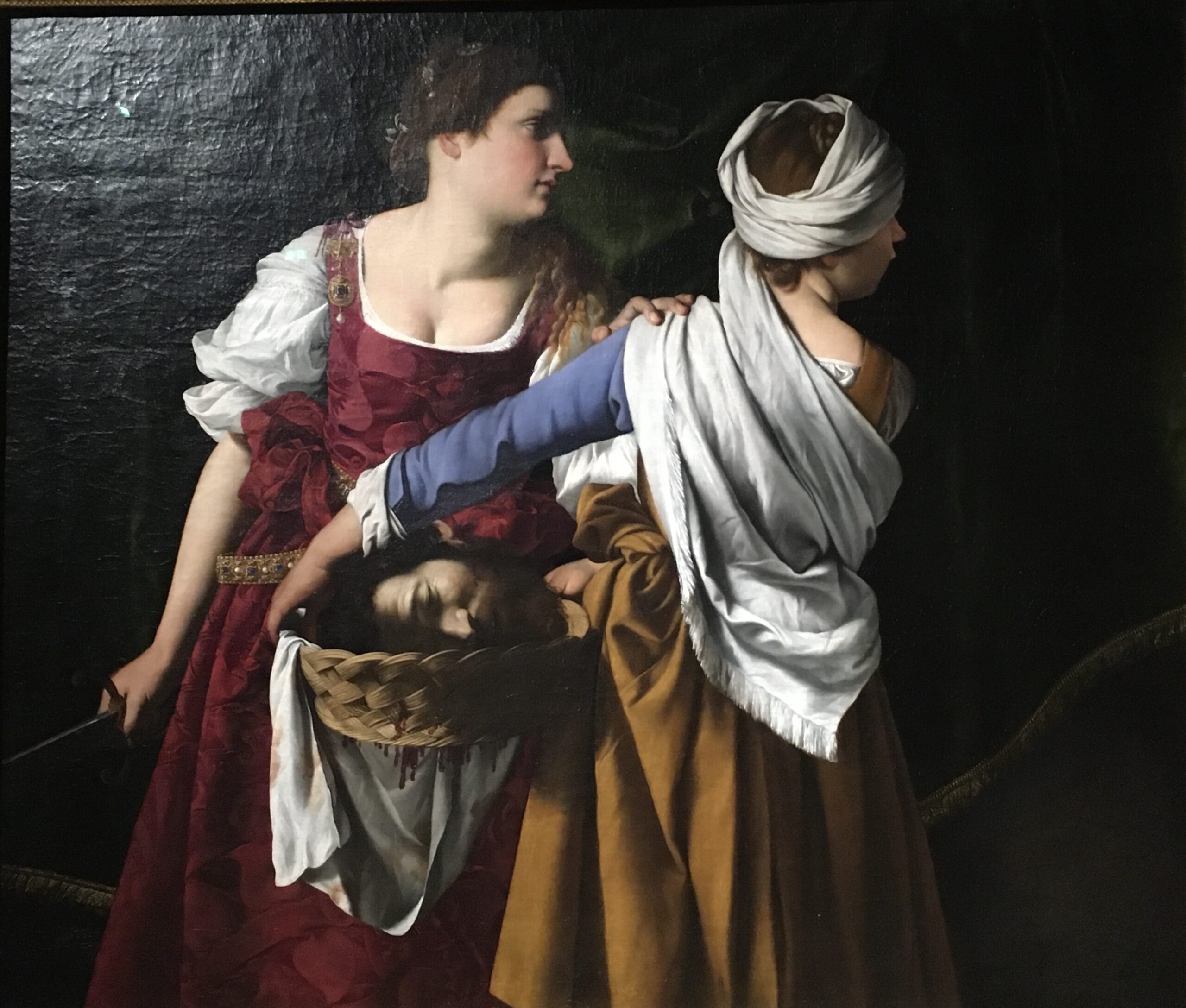 Orazio Gentileschi rappresenta il momento successivo al delitto. Giuditta e l’ancella, entrambe giovani sono ritratte in un momento di pausa durante la fuga e Giuditta pone la mano sulla spalla della giovane quasi a rassicurarla.