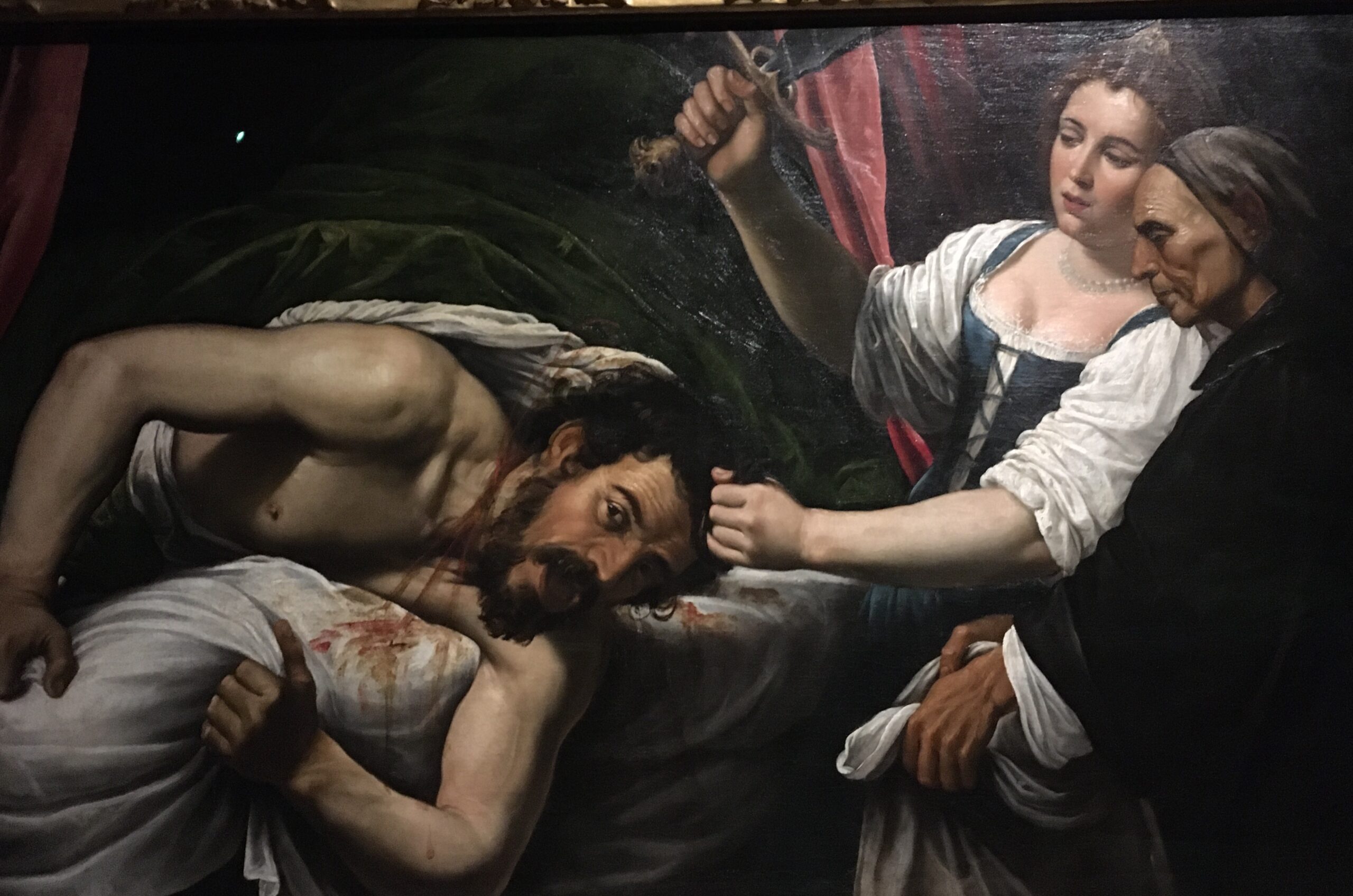 La seconda tela dipinta da Artemisia guarda all’opera del padre ma con più forza e senza indulgere da parte di Giuditta nella complicità con l’ancella ma sottolineando la forza espressiva e il carattere della protagonista.