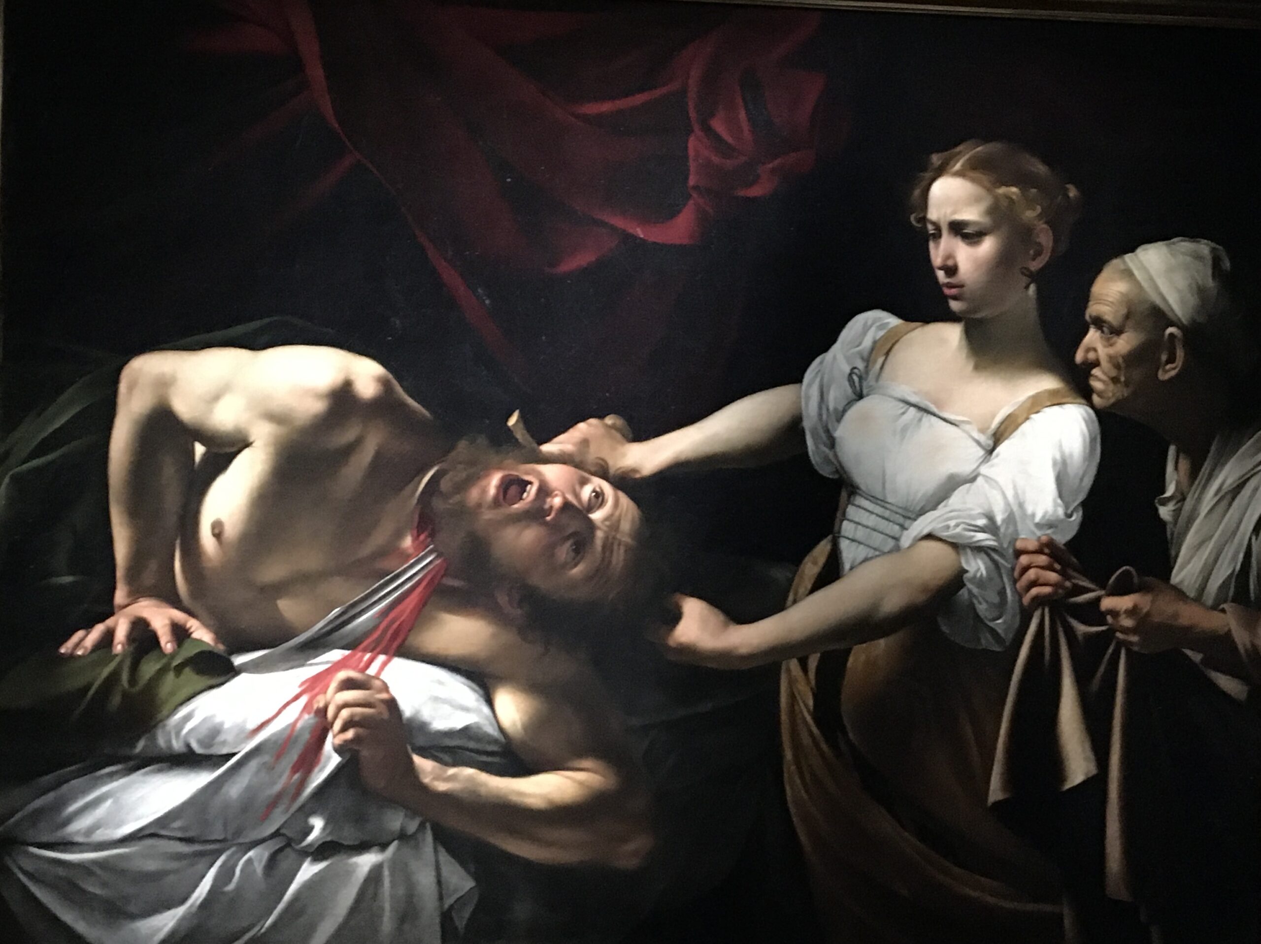 L’ultimo dipinto in ordine cronologico che possiamo ammirare a Palazzo Barberini è il Martirio di Sant’Orsola, realizzato a Napoli nel 1610, sulla via del ritorno per Roma. Il committente fu Marco Antonio Doria, figlio del doge. Fu commissionato in onore della figlia della seconda moglie di Doria che viveva in un monastero napoletano e aveva scelto di chiamarsi Orsola, come la martire cristiana È l’attimo in cui la freccia, scagliata contro la giovane martire, la coglie attonita, immersa in una luce brillante mentre le tenebre sprofondano i suoi aguzzini nel buio dell’oscurità del peccato. Un quadro potente, testamento del mancato ritorno a Roma per la morte del pittore in circostanze mai chiarite che ci ha privati di un genio scomparso troppo giovane che avrebbe potuto creare molte alte opere strabilianti per innovazione, realismo ed analisi psicologica.
