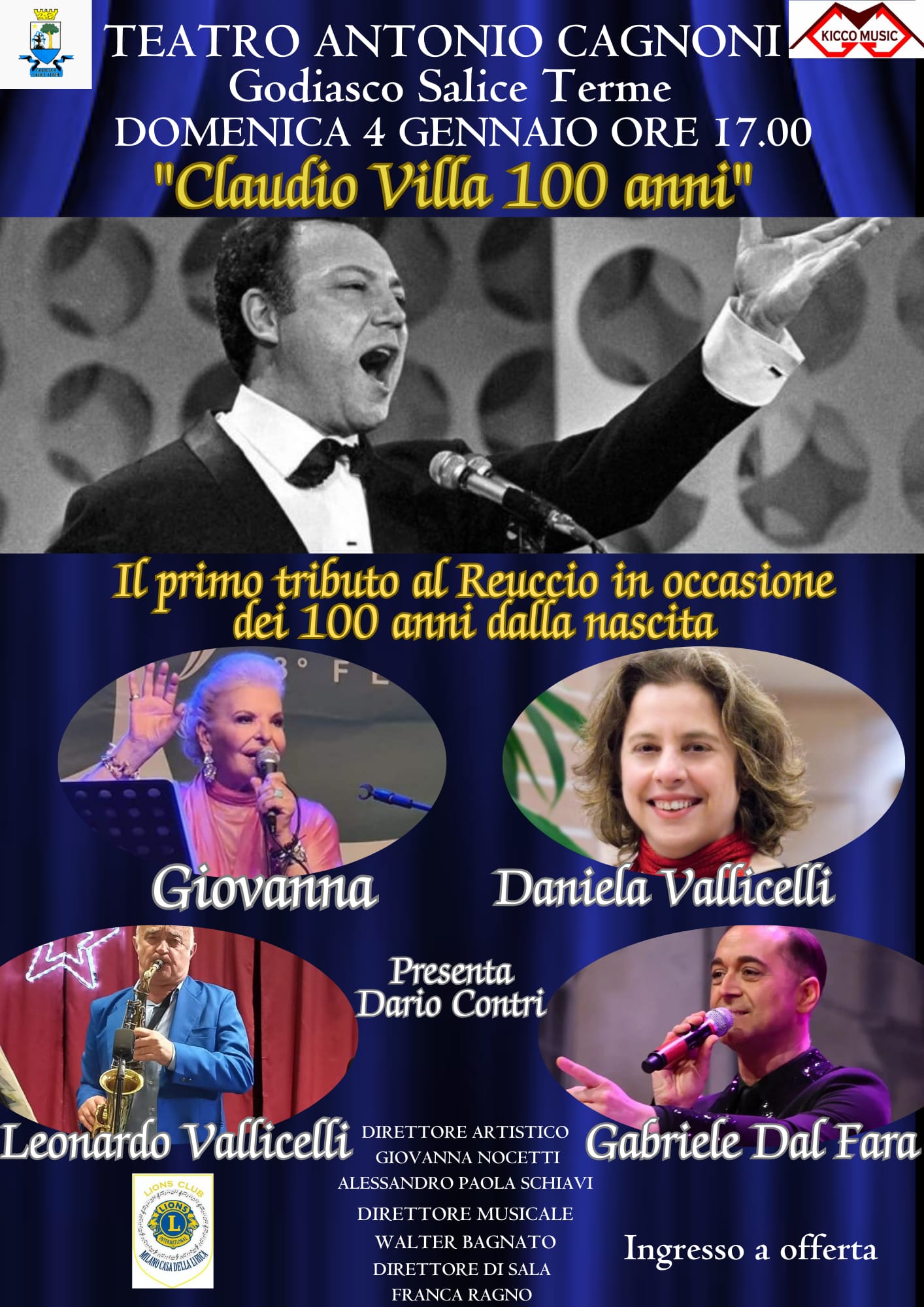 Domenica 4 Gennaio, il Teatro Cagnoni di Godiasco Salice Terme ospiterà uno spettacolo unico in ricordo di Claudio Villa, uno dei più grandi interpreti della musica leggera italiana. L’evento, organizzato da Giovanna Nocetti, amica e collega di Villa, sarà un tributo alla sua vita e alla sua carriera, che ha attraversato oltre tre decenni e ha lasciato un segno indelebile nella storia della musica italiana.