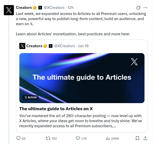 La scorsa settimana abbiamo esteso l’accesso agli Articoli a tutti gli utenti Premium, sbloccando un nuovo, potente modo per pubblicare contenuti lunghi, costruire un pubblico e guadagnare su 𝕏. Creator, scrittori, giornalisti, leader di pensiero: se la scrittura lunga è la vostra arte, questo è il momento di puntare tutto su 𝕏. Diteci cosa volete vedere nel 2026.