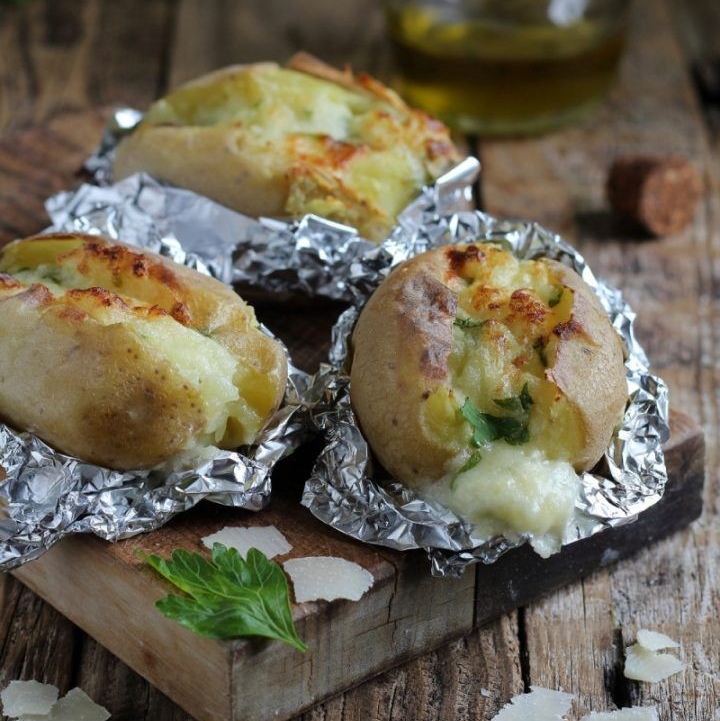 Prendi una grossa patata, avvolgila nella stagnola e lasciala sulla griglia o sui carboni ardenti per 20 minuti.