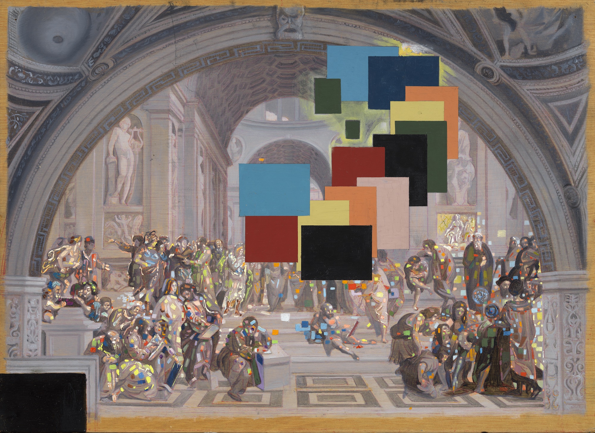 L’omaggio a Vermeer passa per La merlettaia, simbolo di una perfezione matematica e cosmica che Dalí associa al corno di rinoceronte, emblema ricorrente della sua fase mistica. Infine, con Raffaello, l’artista esplora l’equilibrio formale e spirituale: La scuola di Atene / El incendio del Borgo (1979) è un’opera stereoscopica che fonde Rinascimento e modernità, visione e scienza.