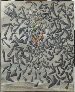 Ma proprio mentre la sua fama cresce come surrealista, Dalí sente il bisogno di andare oltre. Negli anni Quaranta e Cinquanta proclama apertamente il desiderio di “diventare classico”: non un ritorno nostalgico, ma una nuova sfida. Studia con rigore i grandi maestri europei – Velázquez, Vermeer e Raffaello – e ne fa i pilastri di una riflessione teorica che culmina nel trattato 50 segreti magici per dipingere (1948), le cui illustrazioni sono esposte per la prima volta in Italia in questa mostra. Con Velázquez, di cui riprende persino i baffi e l’ossessione per Las Meninas, esplora lo spazio, la luce e l’aria come materia pittorica. Con Vermeer, maestro della calma e della precisione, scopre nella Merlettaia la spirale logaritmica, che diventa la chiave della sua “mistica nucleare”, una fusione di scienza moderna e spiritualità. Con Raffaello, infine, dialoga sulla perfezione e l’armonia, rielaborando temi religiosi con geometrie atomiche e figure scomposte in particelle, dove il Rinascimento incontra la fisica contemporanea.