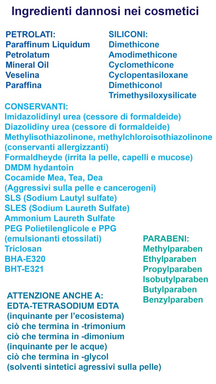 Con questo articolo quindi ho voluto spiegarvi l’importanza di evitare gli ingredienti dannosi e vi ho elencato i principali ingredienti da evitare quando si sceglie un qualsiasi prodotto cosmetico. Dato che ricordare tutti questi nomi a memoria quando siamo al supermercato o in profumeria è molto difficile ho pensato per voi una pratica lista, che troverete in fondo all’articolo che potrete stampare e portare comodamente con voi durante gli acquisti così non correrete il rischio di incappare in prodotti dannosi o mal formulati.