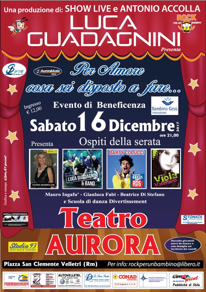 Sul palco del teatro Aurora di piazza San Clemente a Velletri (RM) oltre a Luca Guadagnini e la sua band –  come sempre gli artisti amici di Rock Per Un Bambino come Beatrice Di Stefano, Gianluca Fabi, Mauro Ingafù e quest’anno anche Viola Valentino. La serata è stata presentata dalla speaker radiofonica presentratrice Tiziana Mammucari e da Giancarlo Aluigi.