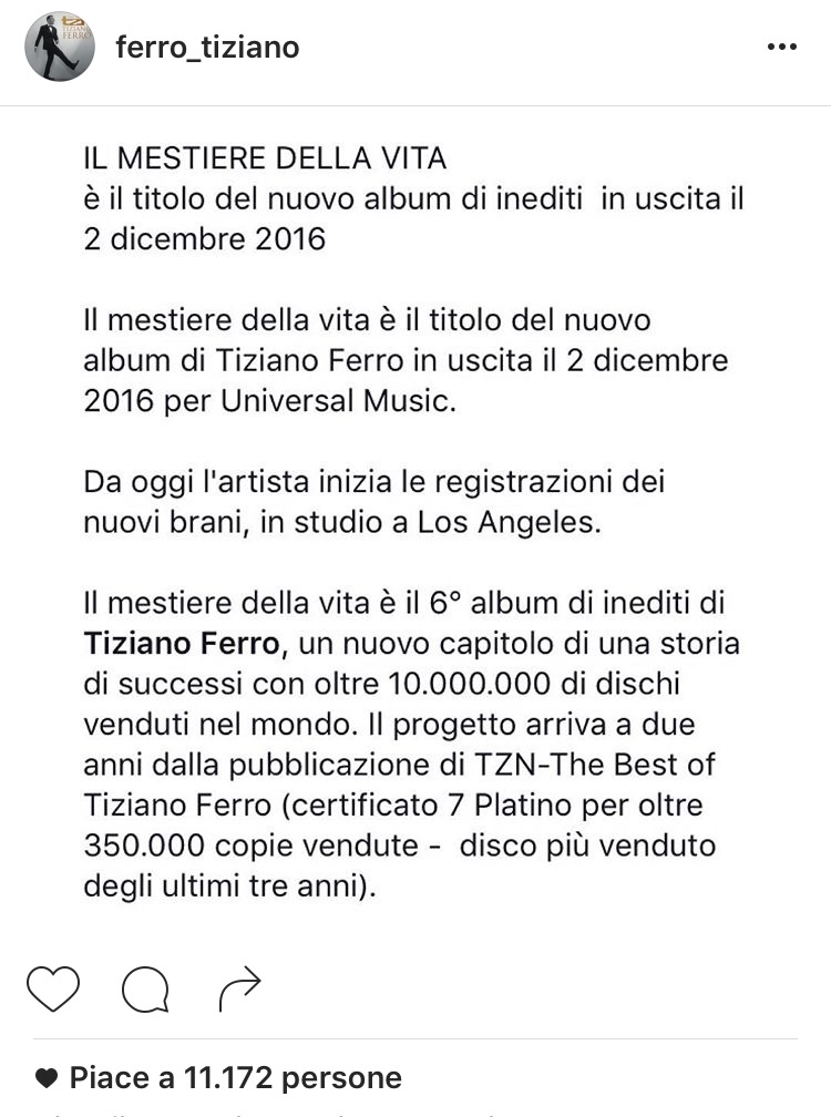 Fans italiani non vi allarmate! via instagram l ‘artista ha dichiarato che ancora sta registrando brani in studio a Los Angeles. Riuscirà il nostro Tiziano a battere il record dei 7 dischi di platino guadagnati grazie a TZN???? Non ci resta che aspettare Dicembre.