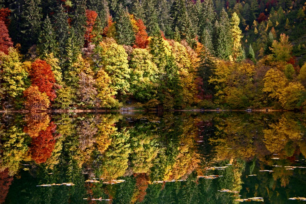 Sotto il BreuilCervinia, nella Val d’Ayas, l’acqua del Lago Blu, uno dei punti più belli della Val d’Aosta, si tinge di rosso e di giallo: sono i colori che le foglie degli alberi dei boschi di conifere, di faggi e aceri riflettono sullo specchio del lago.