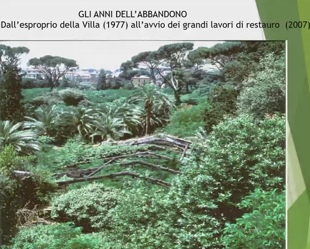 In alcune fotografie scattate negli anni precedenti, ci si può rendere conto dello stato di abbandono in cui versavano gli ambienti. In particolare, per quanto concerne la Serra, erano rimasti solo lo scheletro della struttura e i pilastri in peperino. I soffittti erano interamente crollati e un fitto strato di vegetazione si era impossessato di quel poco che rimaneva.