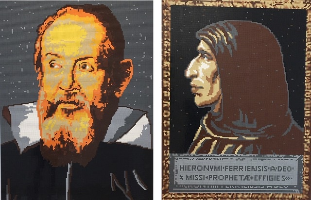 Ad alcuni personaggi italiani del passato considerati scomodi e controversi, Ai Weiwei ha dedicato alcune opere in mostra. Sono ritratti realizzati con la tecnica a mosaico utilizzando quasi diecimila mattoncini Lego. Dante Alighieri, condannato in contumacia e mandato in esilio, Filippo Strozzi, bandito dalla famiglia Medici e rientrato a Firenze dopo vent’anni. Galileo Galilei, rivoluzionario scienziato toscano emblema della libertà di pensiero, incarcerato e processato per aver difeso le proprie idee. Girolamo Savonarola, frate predicatore inviso alla Curia, giustiziato per i sermoni contro la Chiesa di Papa Borgia. I volti sembrano immagini della Pop art, mutuati da Andy Wharol, utilizzando il materiale democratico dei mattoncini Lego, che tutti conoscono e che tutti possono avere.