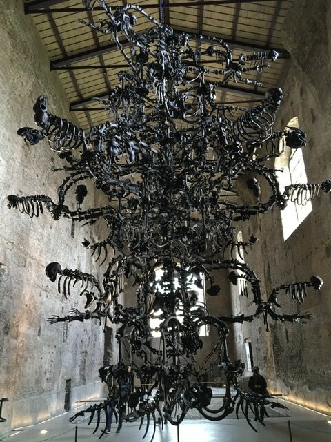 È stata un’opera concepita durante la pandemia ma in questo periodo ha assunto con la guerra ulteriori significati. Il lampadario è composto da ossa, viscere, organi. È l’emblema della nostra caducità espressa in tutte le sue parti. L’artista ha voluto usare il vetro perché come la vita è fragile, delicato e necessita attenzioni.