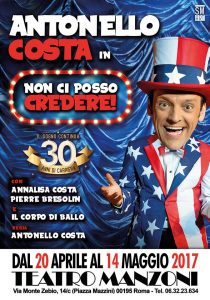 “NON CI POSSO CREDERE”, il nuovo spettacolo scritto, diretto ed interpretato dal vulcanico e strabiliante Antonello Costa, è in scena al Teatro MANZONI di Roma da Giovedì 20 Aprile fino a Domenica 14 Maggio.