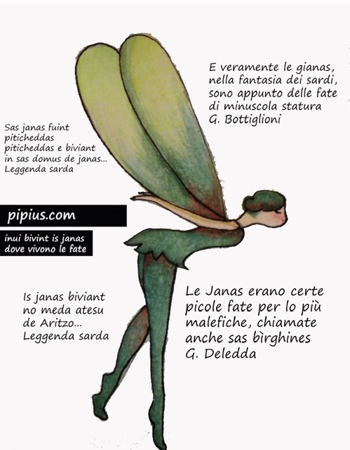 Il nome janas che deriva da leggende tramandate nei secoli si può tradurre con il sostantivo di Fate e si riferisce ad esseri minuscoli di genere femminile che potevano stare nel palmo di una mano e che uscivano solo la notte dalle loro grotte per non rovinare la loro pelle bianchissima alla luce del sole. Creature fragili e birichine, vestite di rosso con scialli ricamati da fili dorati.