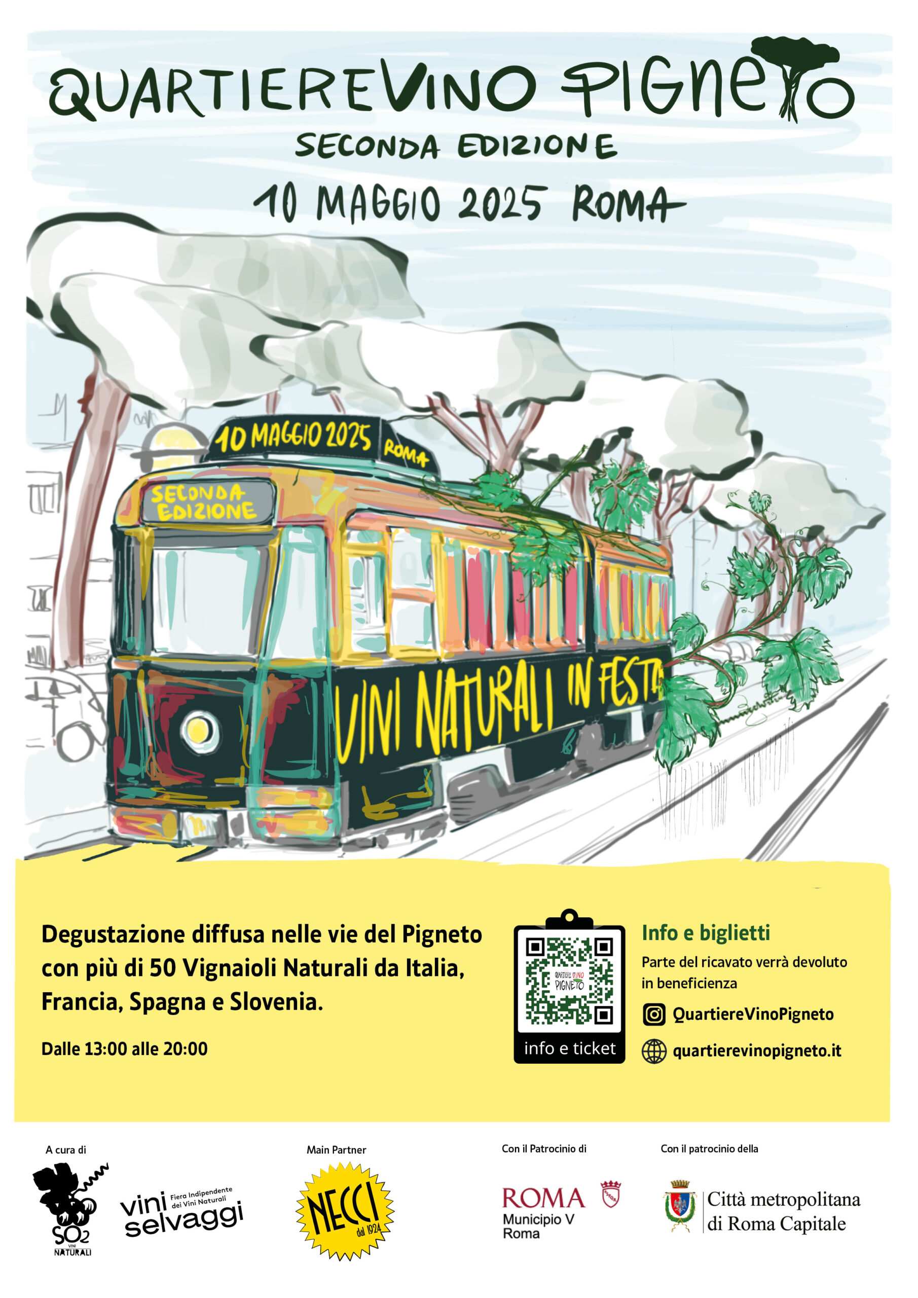 Dopo il grande successo della prima edizione, torna sabato10 maggioQuartiereVino Pigneto, l’evento romano dedicato al vino naturale e alla scoperta dell’impulso culturale del quartiere Pigneto. Un’iniziativa che unisce enogastronomia, arte e cultura per valorizzare una delle zone più dinamiche e affascinanti di Roma. L’evento porta la firma di SO2, enoteca e società di distribuzione di vini naturali italiani ed europei attiva da molti anni nel settore – composta da Alfonso Scarpato e Caterina Frontino -, e di Vini Selvaggi, celebre Fiera Indipendente di Vini Naturali nata nel 2019 e organizzata da Lorenzo Macinanti, Giulia Arimattei e Francesco Testa.