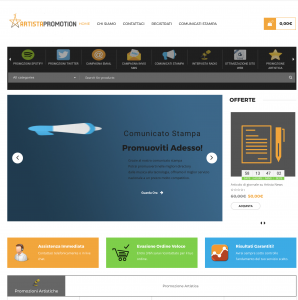 Artista Promotion offre rispettivamente nella sezione Promozioni Artistiche i seguenti ordini: ingaggio di un dj per una festa privata o un evento, management di un Artista, consulenza artistica, intervista dal vivo con audio e video, autista privato, creazione di jingle e spot, social manager, promozione singolo in radio con rotazione, servizio fotografico a Roma, intervista in radio con podcast.