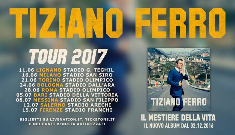 L’Universal , sua etichetta discografica , ha pubblicato le date del tour che vedrà protagonista Tiziano la prossima estate. Sicuramente sarà uno dei tour più attesi del 2017 visto che non mancheranno scenografie e coreografie pazzesche come è già accaduto 2 anni fa nella sua ultima tournè. Il cantante tornerà negli stadi e i biglietti saranno disponibili dal 7 ottobre alle ore 10 su livenation.it in prevendita e dal 10 ottobre alle ore 10 sarà aperta direttamente la vendita dei tickets sia su livenation.it che su ticketone.it . Siete pronti al comeback di Tiziano Ferro???