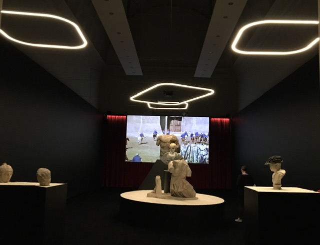 Molto affascinante l’altra opera di Vezzoli presente in sala: Lo sguardo di Adriano del 2018, una testa in marmo del II sec.d.C. dipinta con pittura acrilica. Le proiezioni della parete di fondo sono tratte dai film Sebastiane del 1976 di Paul Humfress e Spartacus del 1960 di Ridley Scott.