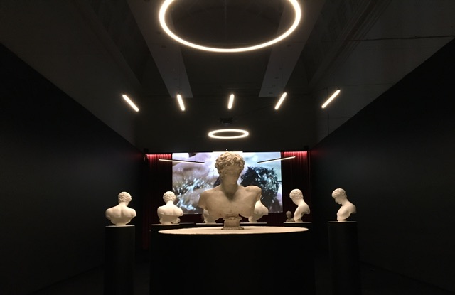 In esposizione troviamo una serie di busti di personaggi storici come l’imperatore Traiano (110 d.C.), Hermes (I-II sec.d.C.), Euripide, e l’opera True Colors di Vezzoli (testa antica, caseina, cera e vernice) del 2014.