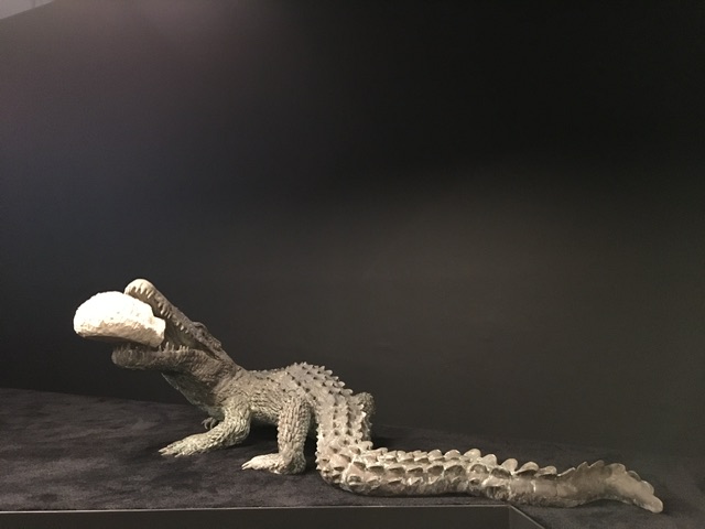 e Lacrime di coccodrillo del 2023, un enorme rettile in bronzo che divora una testa in marmo di Palmira del III sec.d.C.