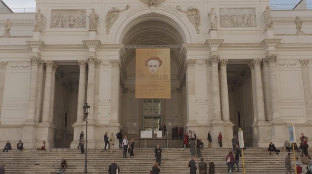 L’artista conduce il visitatore attraverso sette sale tematiche che dialogano con l’altro protagonista: il cinema. Un’arte che ha sempre celebrato in modo egregio e universale il periodo storico dell’Antica Roma, cercando di restituire la verità, le atmosfere e i colori di un momento fondamentale della nostra cultura. Il titolo VITA DULCIS è un omaggio al famoso film di Federico Fellini, La Dolce Vita del 1960. Dal viaggio di Fellini nei meandri della Dolce Vita romana, Vezzoli trae l’ispirazione per un viaggio all’interno della Vita romana dell’antichità.