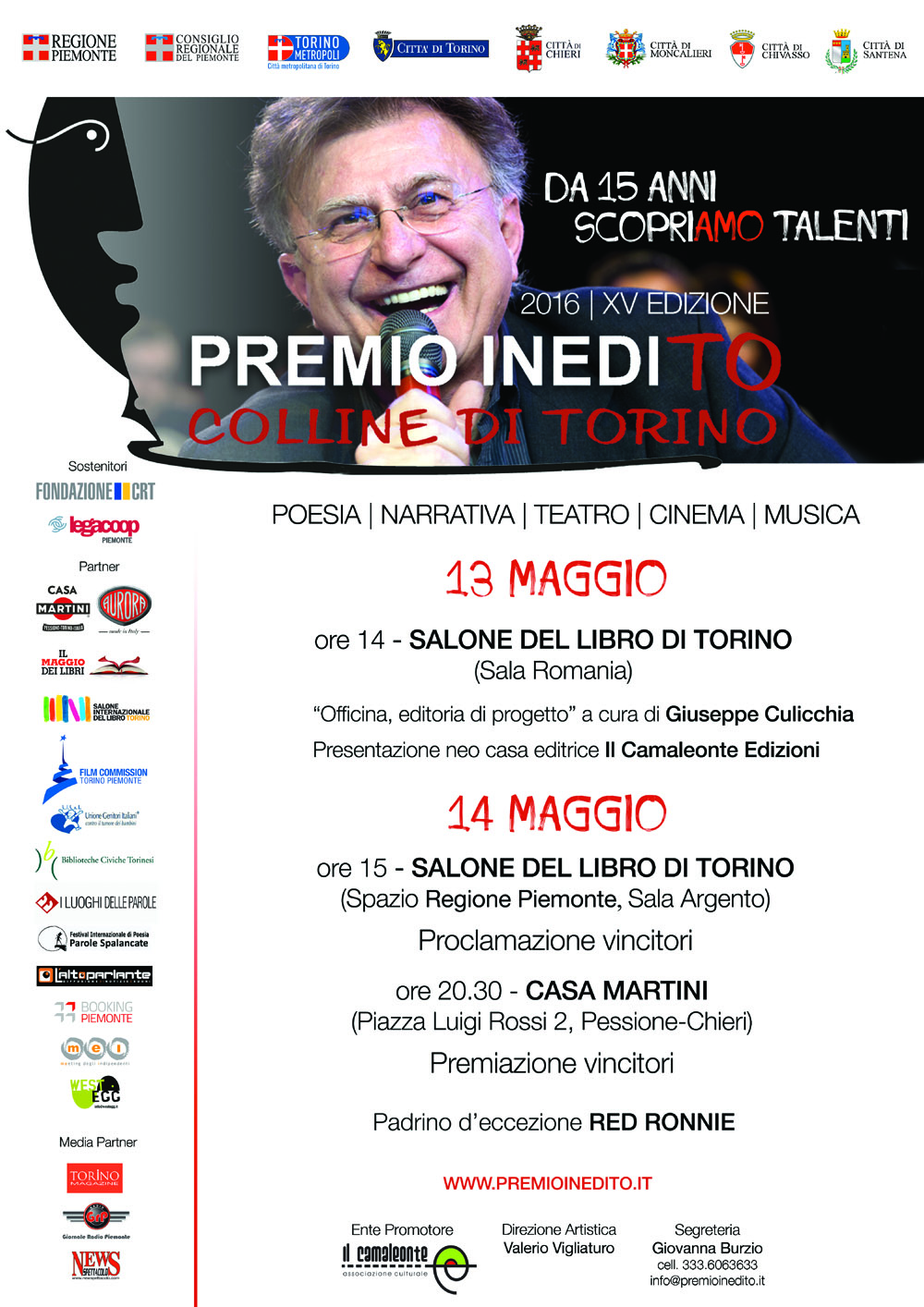 La proclamazione dei vincitori (la lista completa verrà pubblicata sul sito www.premioinedito.it), si terrà alle ore 15 al Salone del Libro di Torino presso la Sala Argento della Regione Piemonte, mentre la premiazione si svolgerà alle ore 20.30 in Casa Martini, i cui prestigiosi ambienti della Terrazza e del Museo di Storia dell’Enologia saranno visitabili e liberamente aperti al pubblico. Padrino d’eccezione il conduttore radiofonico e televisivo RED RONNIE, grande talent scout della musica italiana, che negli ultimi anni ha continuato a promuovere la musica, l’arte e la cultura attraverso la sua Roxy Bar TV. Mentre MORGAN, membro della giuria del concorso, attualmente impegnato nel talent show Amici, si collegherà dal vivo via streaming. InediTO in questi anni ha ospitato tanti artisti italiani come Eugenio Finardi, Alessandro Haber, Francesco Baccini, Arturo Brachetti, Flavio Oreglio, David Riondino, Fabio Troiano, Ettore Bassi, Gnu Quartet, Sara D’Amario e internazionali come Marc Augè.