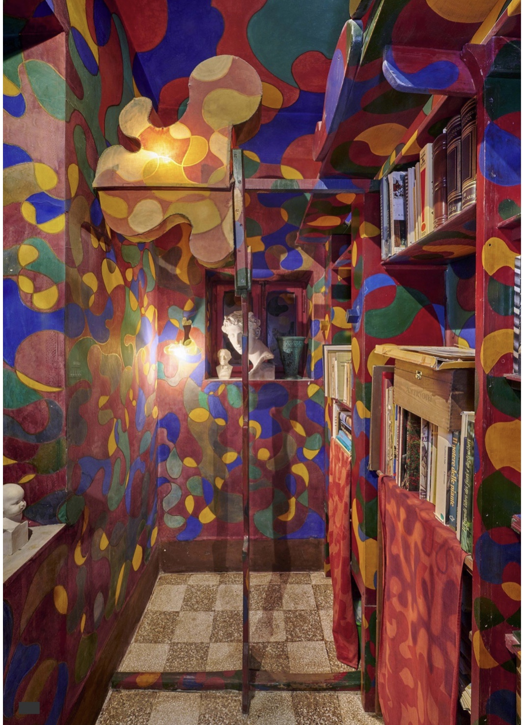 Ed ecco il corridoio con i gialli, i verdi e gli azzurri a riempire le forme dinamiche, i quadri del pittore ad incorniciare la sommità delle pareti come in una processione laica.