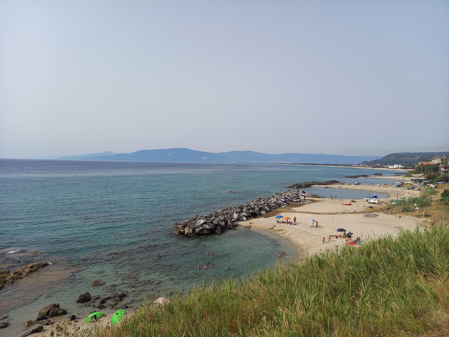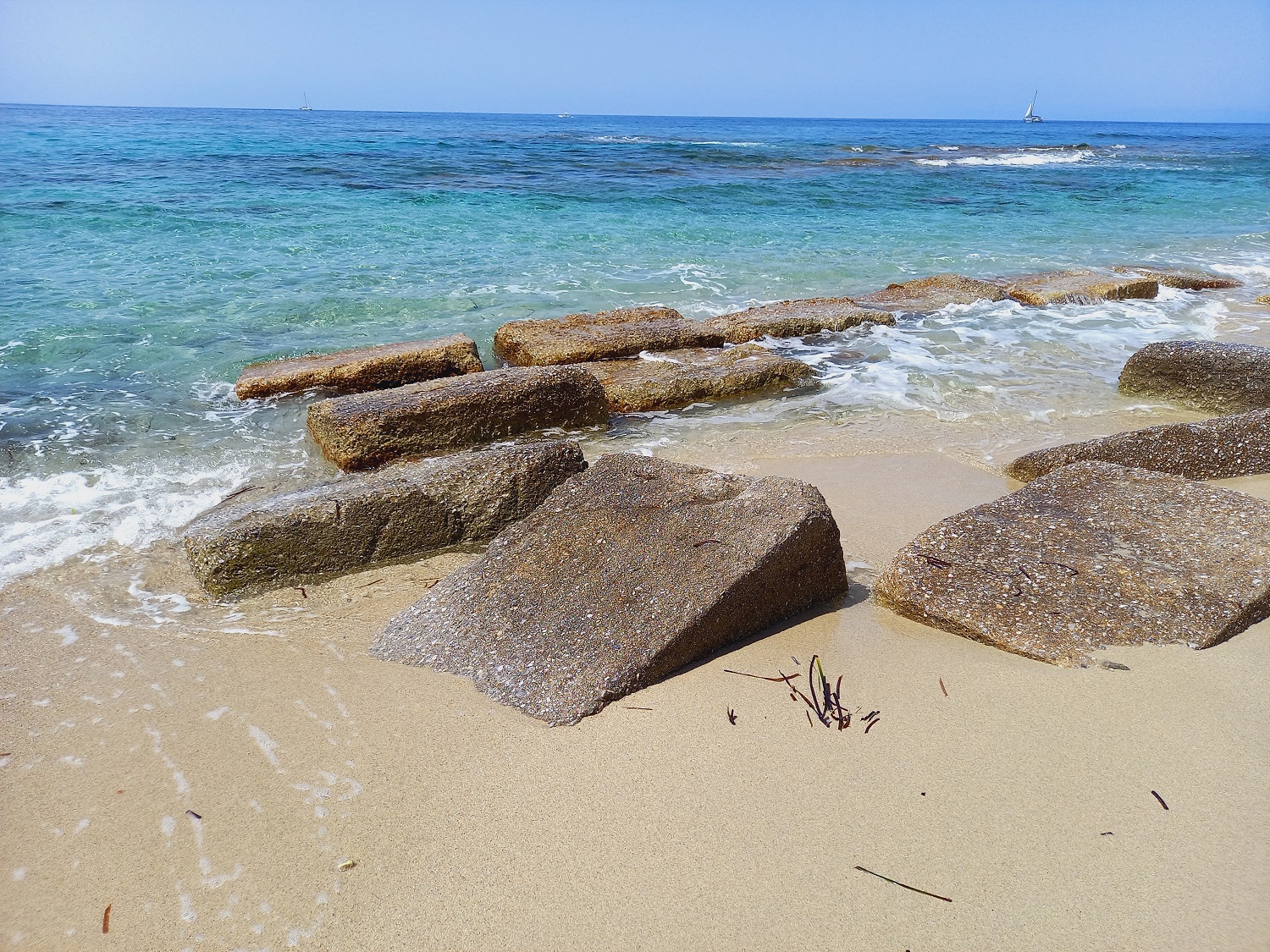 Le rovine sommerse dell’antico porto, sono visibili in parte dalla riva. Qui la costa è caratterizzata da una sabbia fine e da falesie in arenaria.