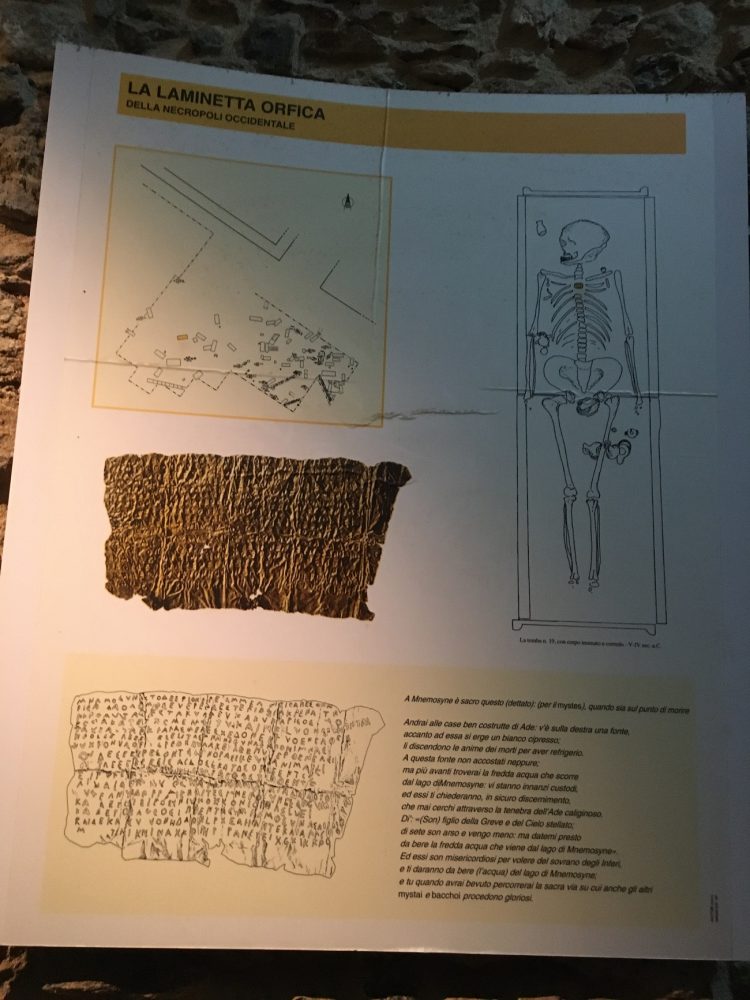 La laminetta precisava di dirigersi alla fonte della Memoria, poiché chi beveva da queste acque era destinato a ricongiungersi al divino. A differenza degli altri, non iniziati, che andavano verso la fonte dell’Oblio ed erano destinati al ciclo di reincarnazione in eterno.